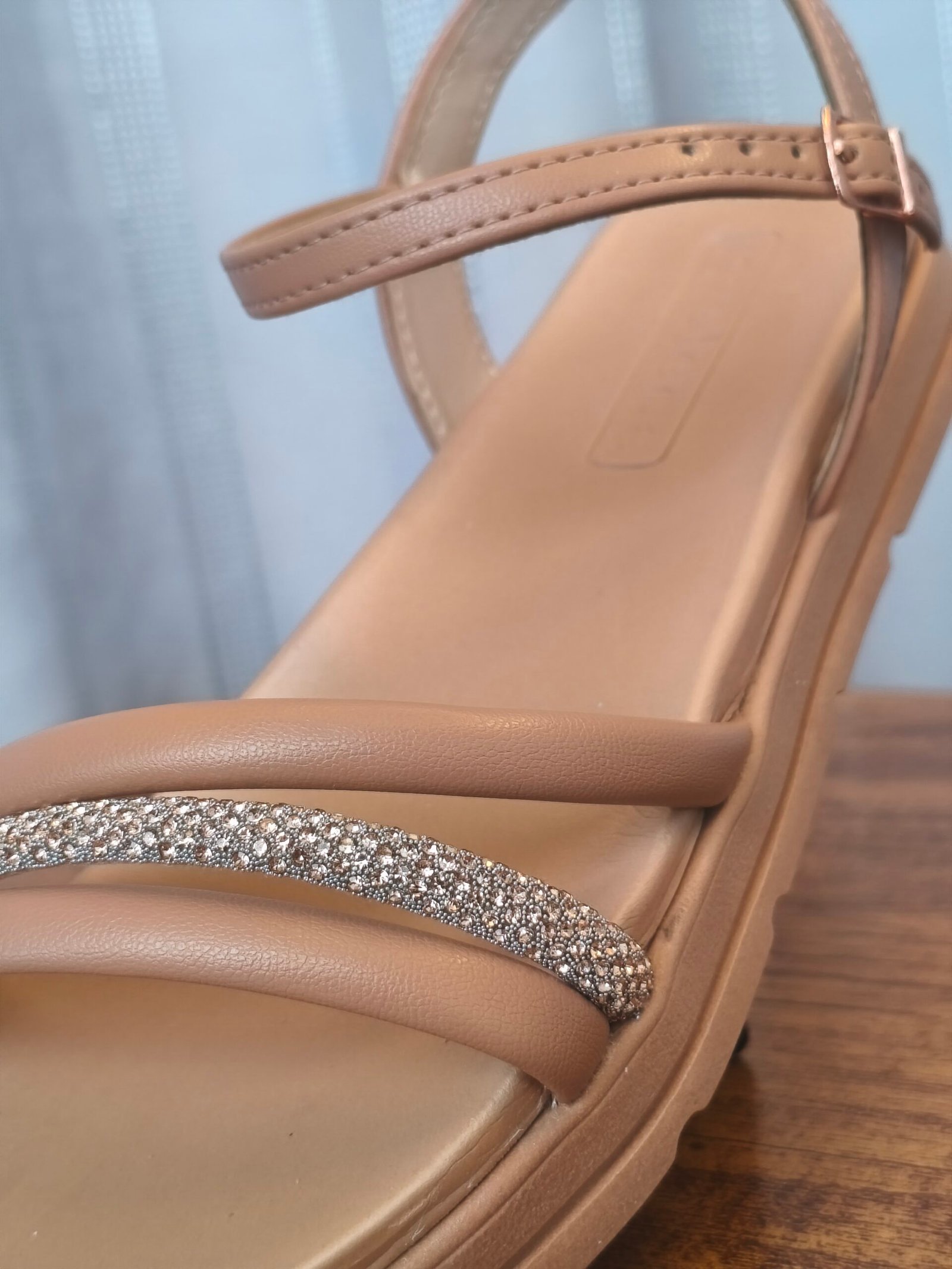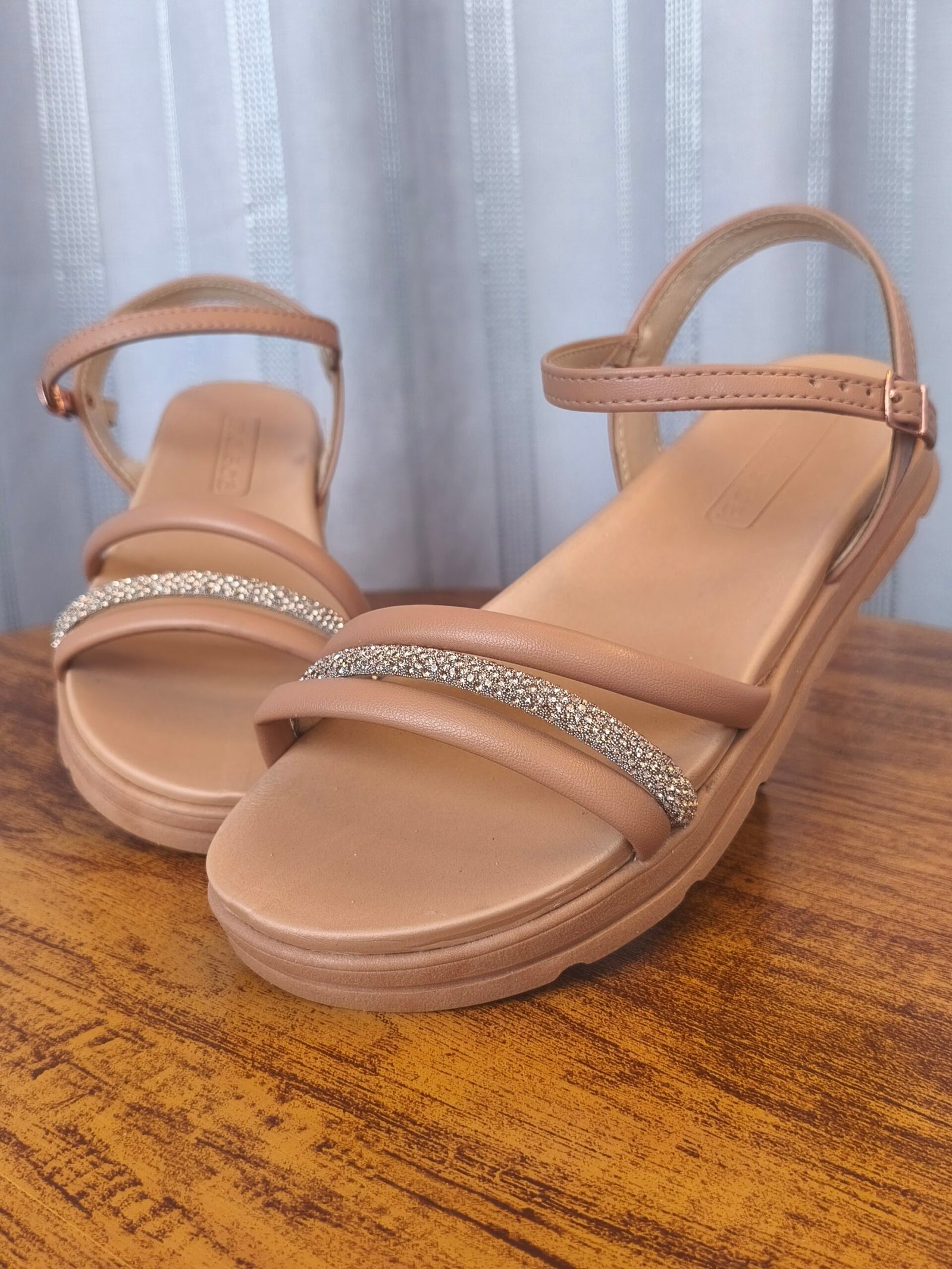 - Detalhes: Tiras delicadas no cabedal e aplicação de strass na tira frontal.