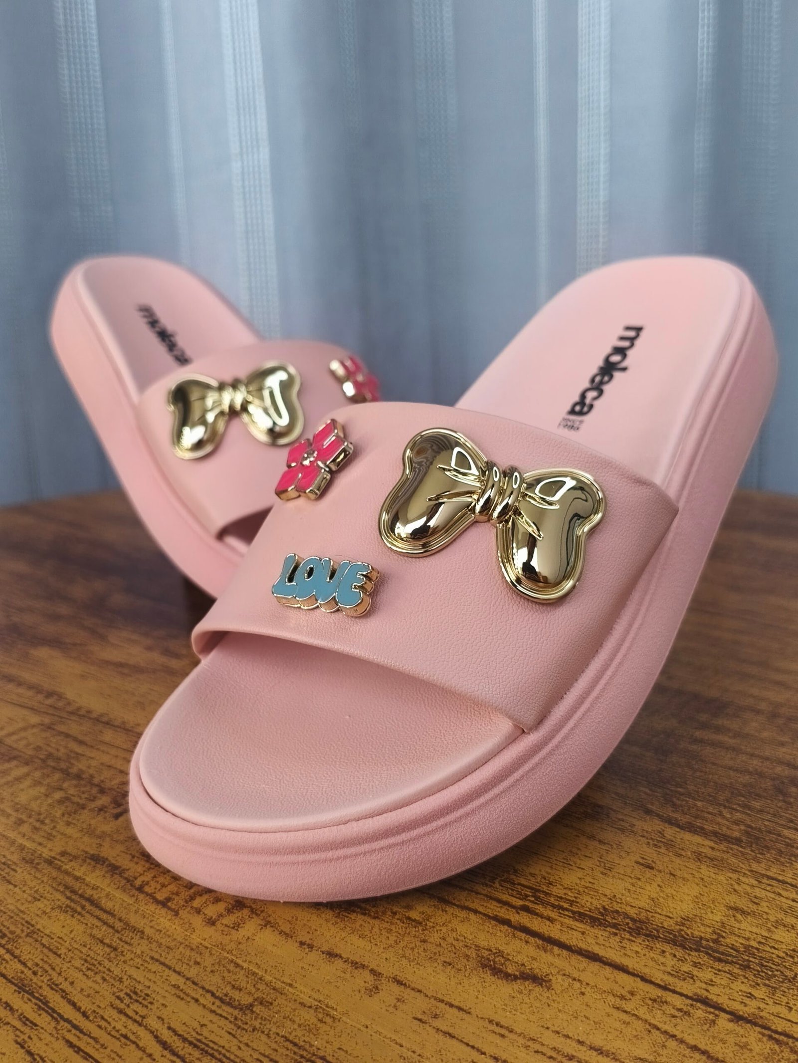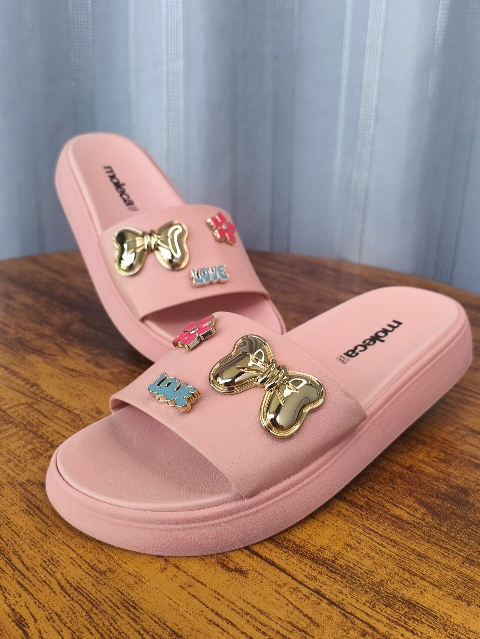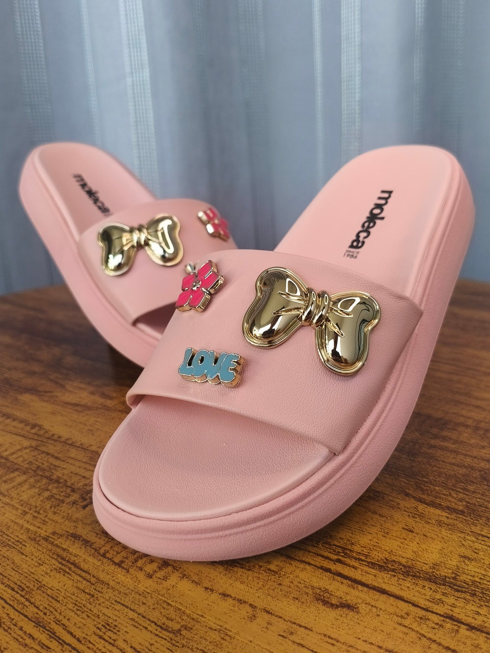 Slide Flatform Moleca com Laço Metalizado e Apliques – Rosa Soft