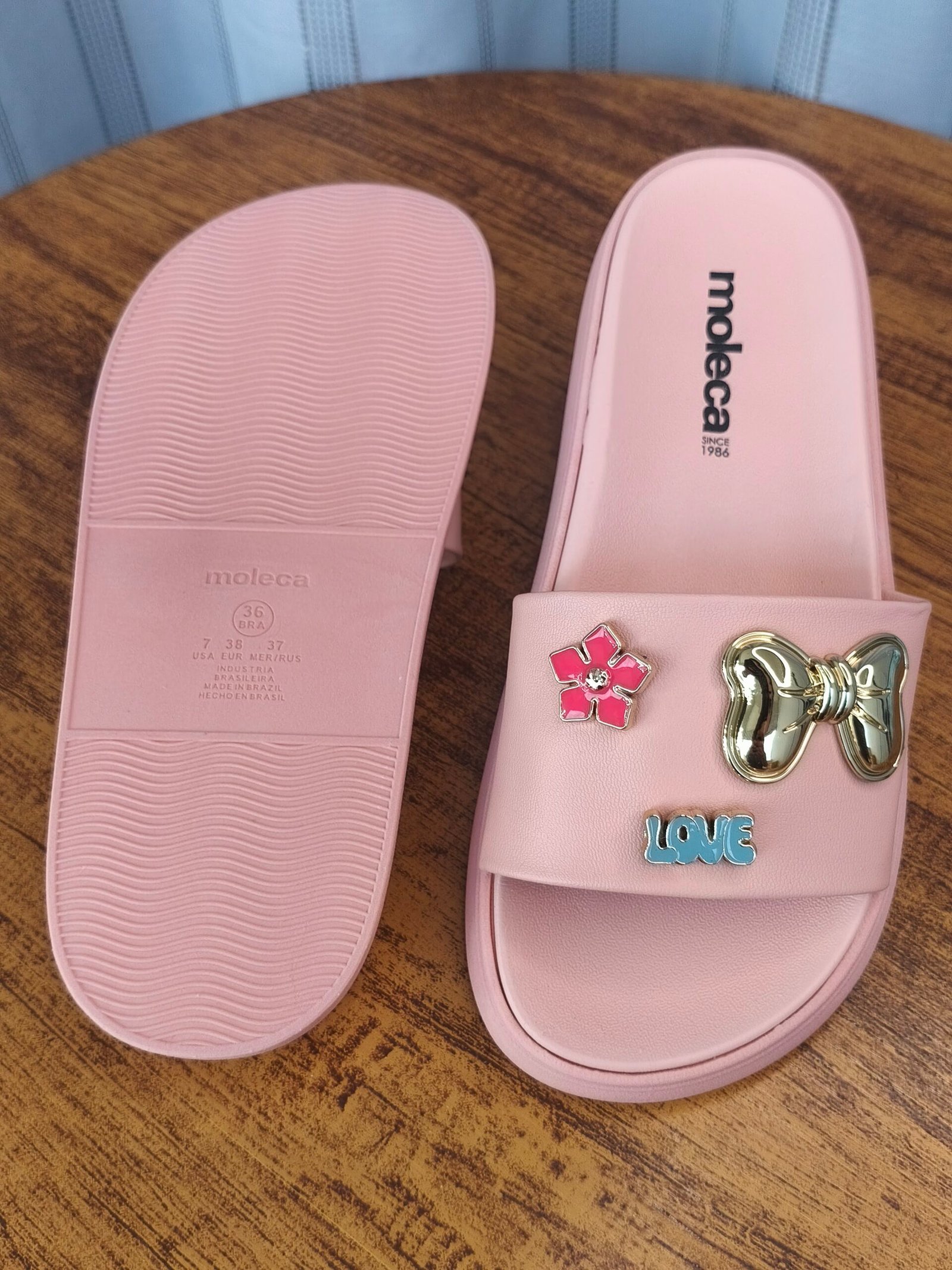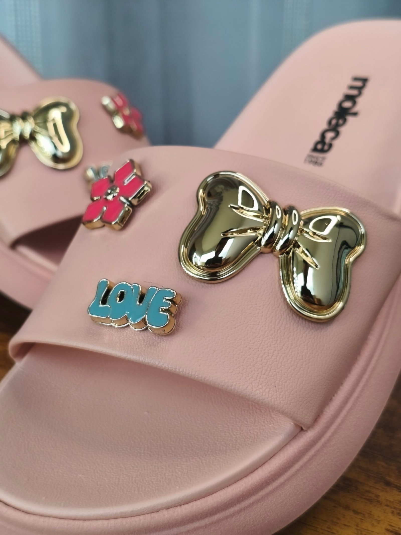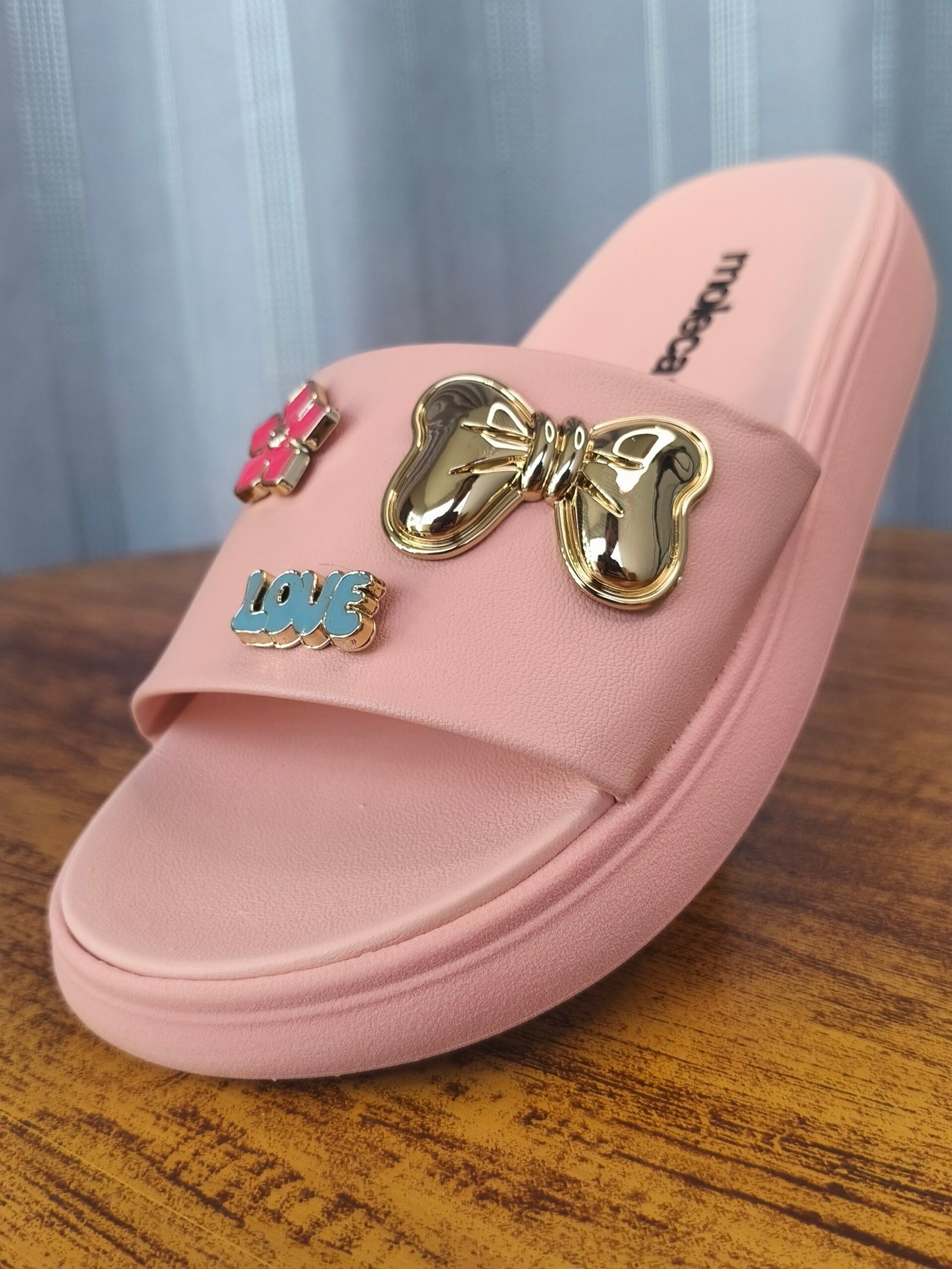 Slide Flatform Moleca com Laço Metalizado e Apliques – Rosa Soft