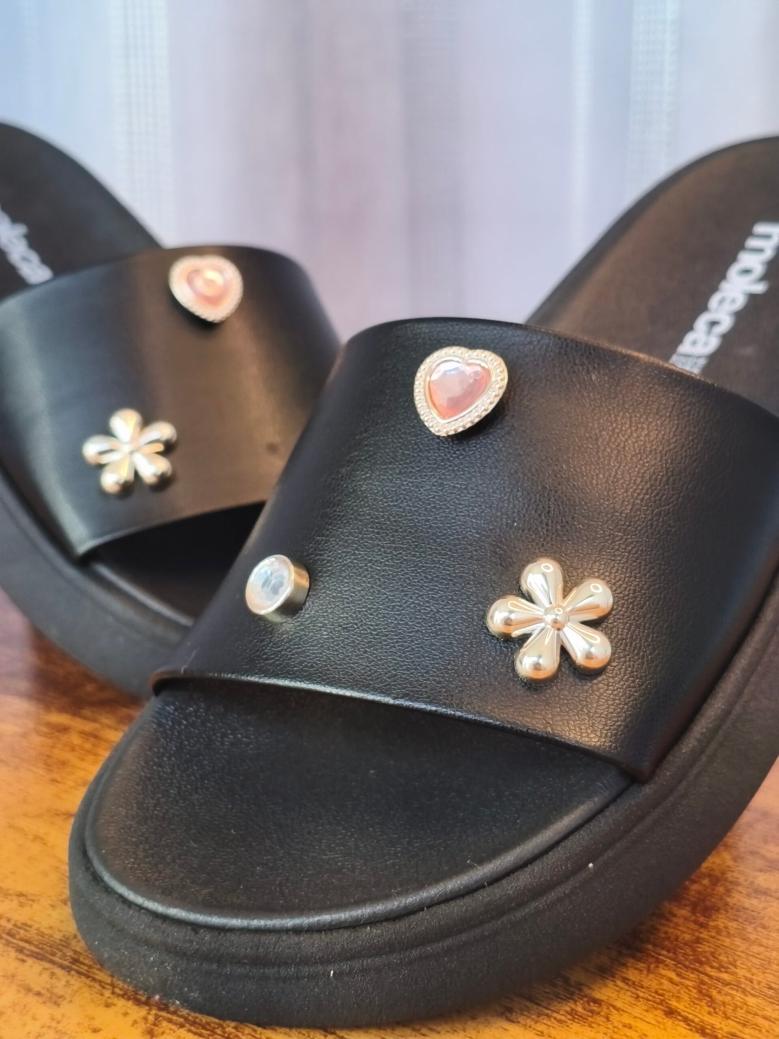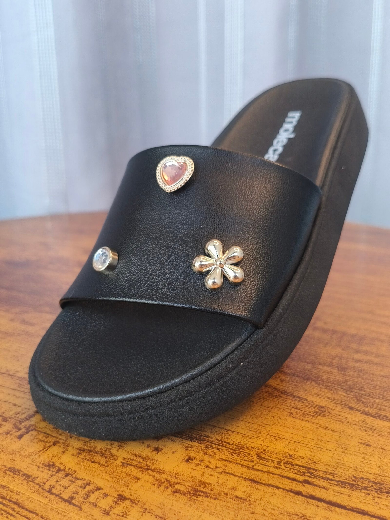 Papete/Slide Flatform Moleca com Apliques de Strass e Flor – Preto