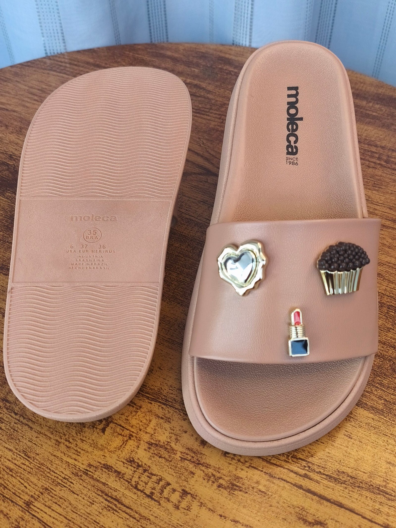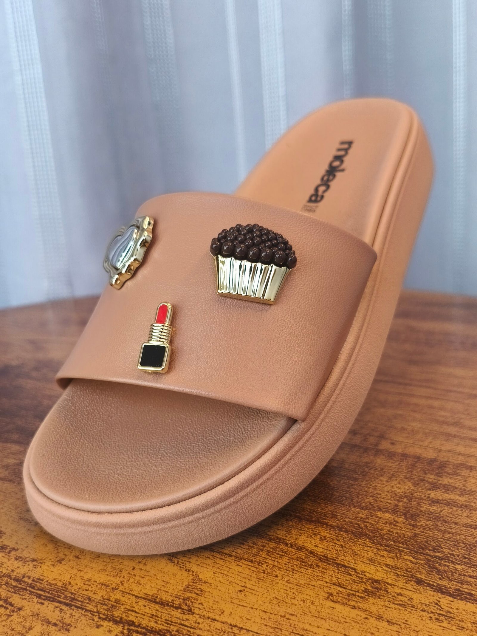 A Slide Flatform Moleca 5469.156 é a combinação perfeita de elegância e diversão. Com uma base na cor Nude/Cacau, um tom neutro e sofisticado, ela se adapta a qualquer look, enquanto os apliques temáticos adicionam um toque de personalidade girly e atual.