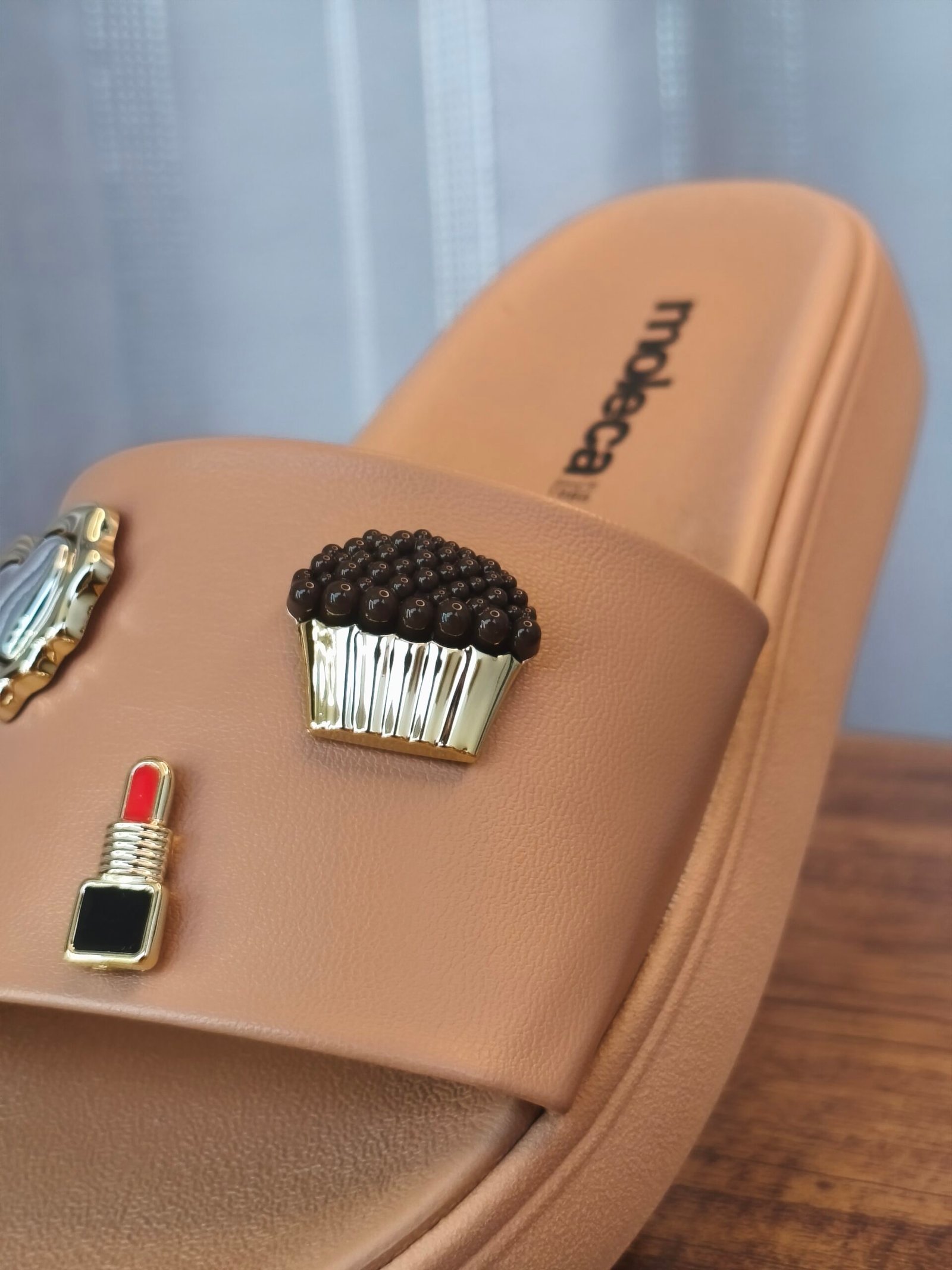 Na tira larga e confortável, os apliques metálicos e esmaltados são o grande charme: