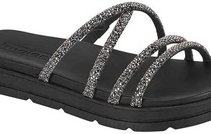 A Moleca une a sua expertise em calçados de extremo conforto com uma dose generosa de glamour. O destaque absoluto deste slide são as tiras cruzadas e frontais completamente revestidas por strass cintilante. O brilho sofisticado eleva instantaneamente o visual, transformando um modelo casual em uma peça perfeita para festas, happy hours ou para dar um toque glam ao seu look do dia.