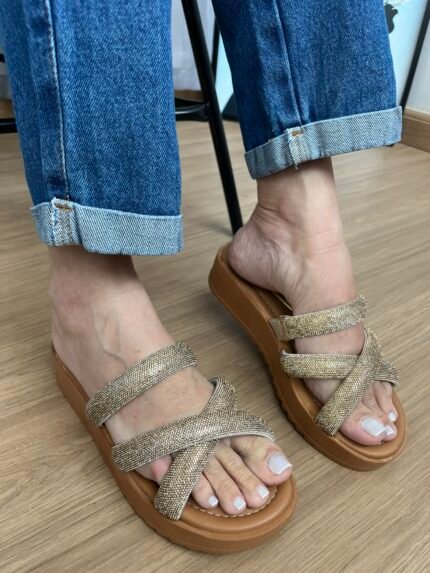 Este slide é ideal para quem quer um toque de brilho e modernidade. Combine-o com peças básicas para que ele seja o ponto focal, ou use com um look mais arrumado para um efeito total glam.