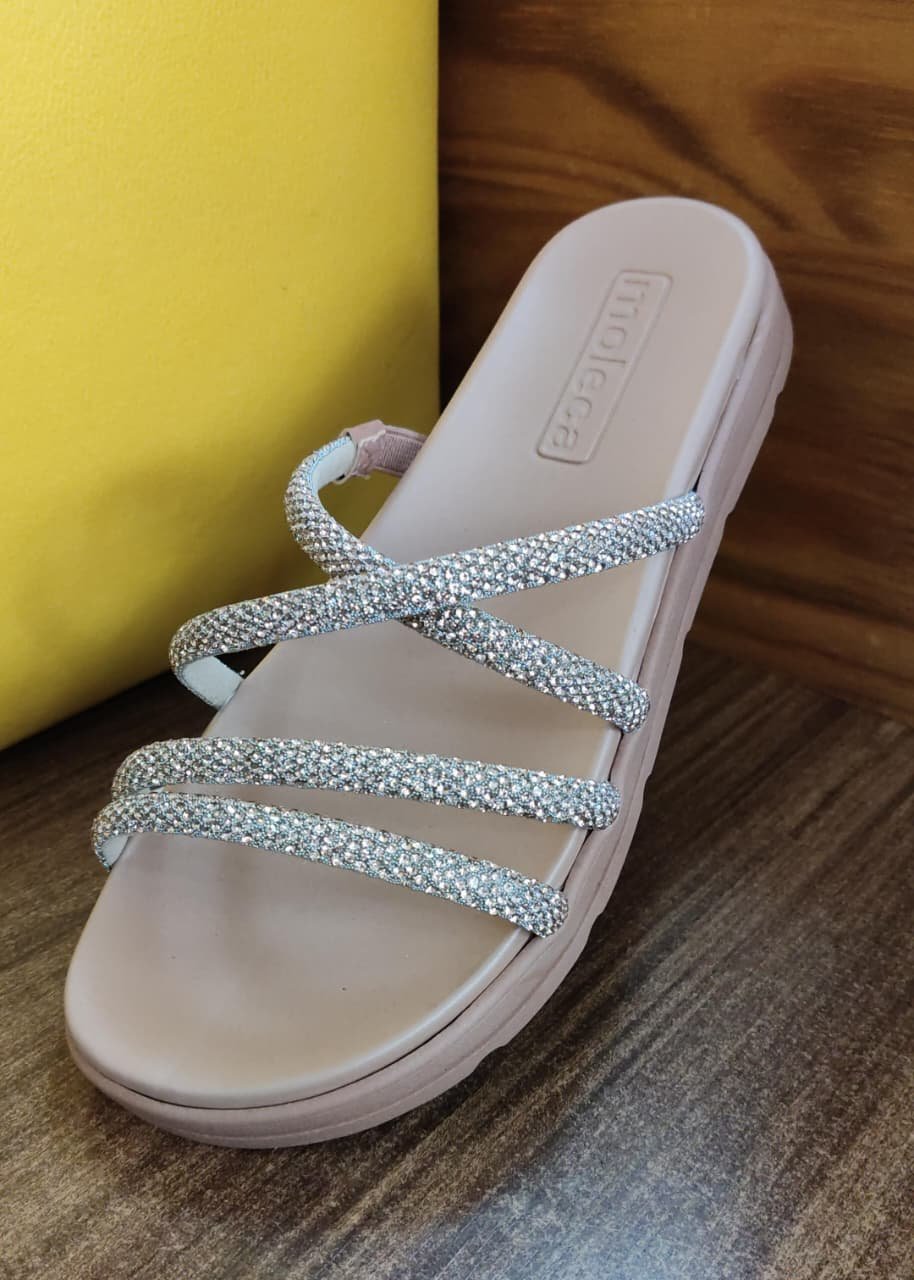 A base em um tom nude/rosa seco harmoniza perfeitamente com o brilho prateado do strass. E o melhor de tudo: você tem o conforto imbatível da Moleca, com uma palmilha macia e uma sola leve que garante que seus pés fiquem descansados e estilosos o dia todo.