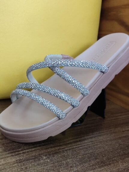 • Detalhe das Tiras: Em algumas variações, ela apresenta quatro tiras (como visto na imagem), sendo que as duas mais largas são cravejadas com strass e as duas centrais podem ser em material sintético ou têxtil, formando um desenho moderno nos pés.