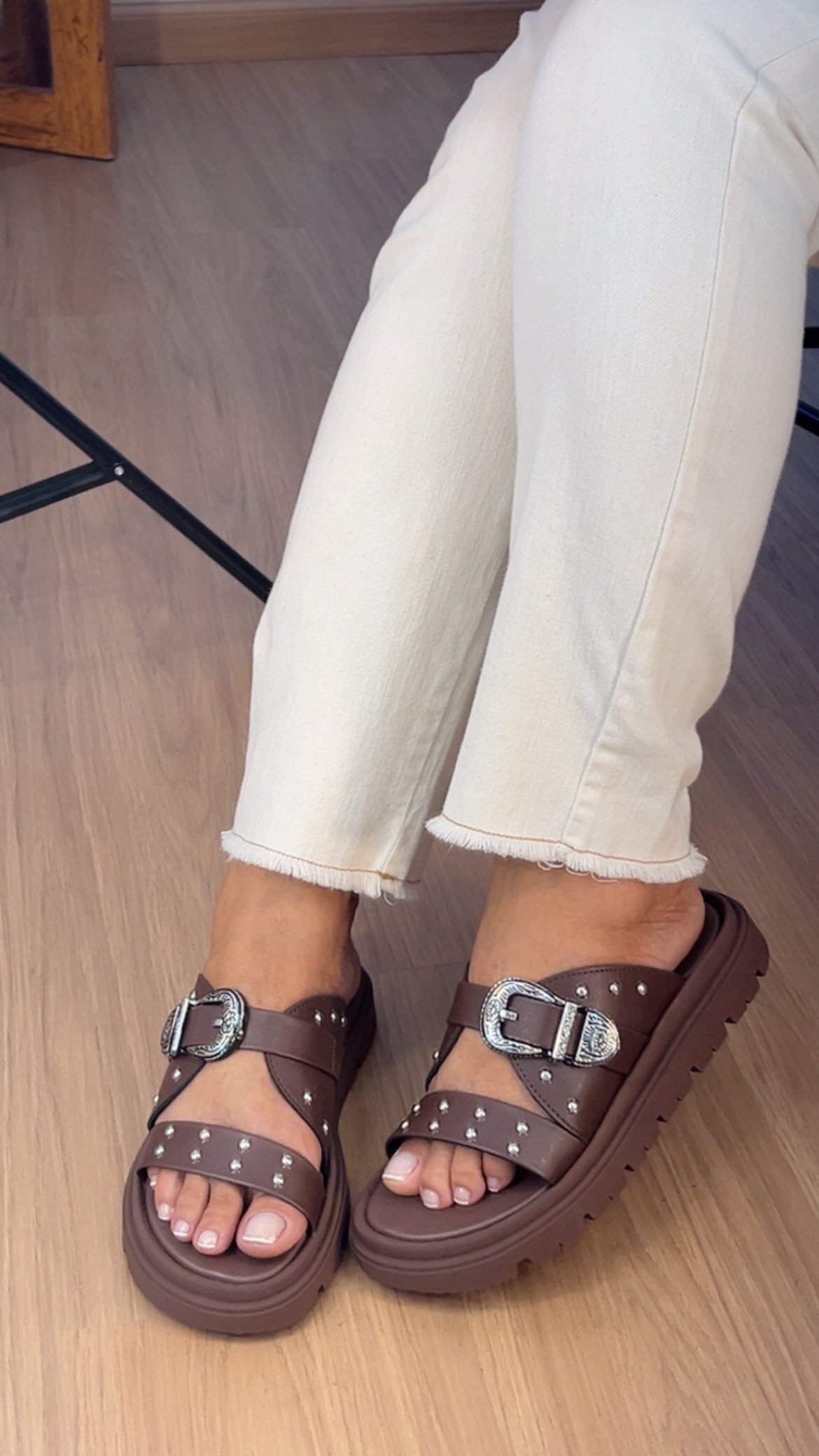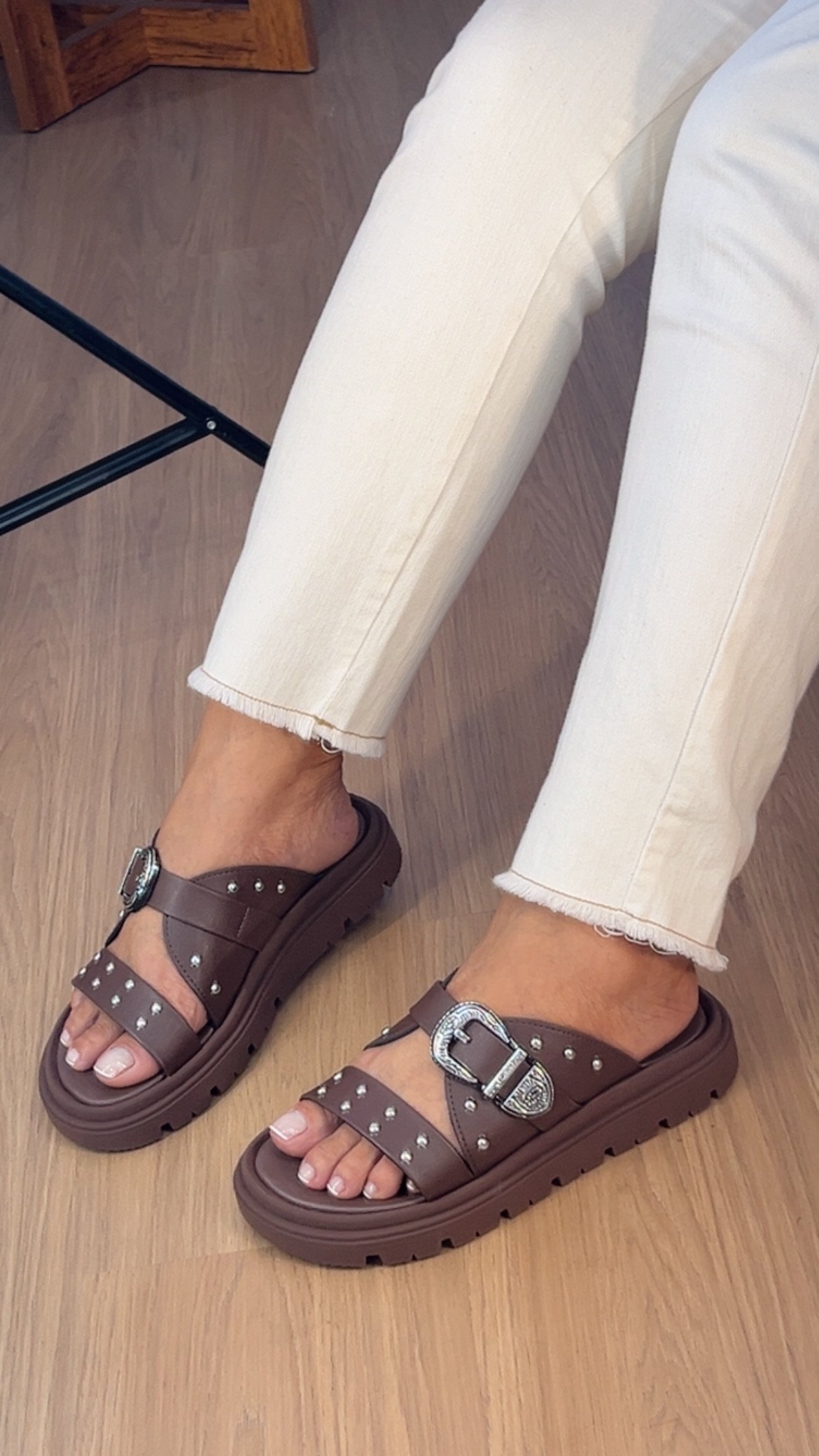 - A tira frontal é pontuada por tachas metálicas arredondadas, que adicionam um brilho sutil e a atitude rocker chic do momento.