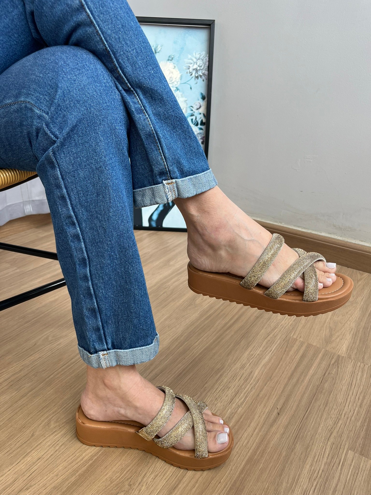 As tiras, sendo a superior reta e a inferior cruzada (em formato “X”), garantem o calce prático e confortável, mantendo o pé seguro. É a escolha ideal para quem não abre mão do conforto, mas quer adicionar um toque de glamour e sofisticação, seja para um passeio casual ou para um evento descontraído.