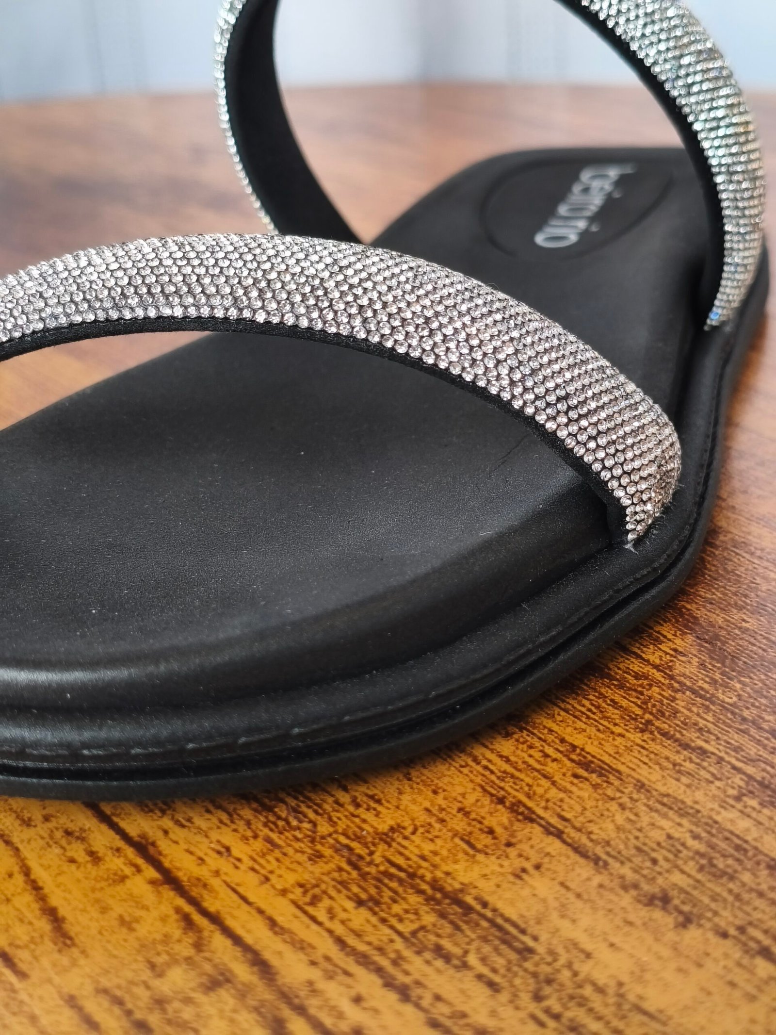 A cor preta da sola e da palmilha confere um visual clássico e versátil, que combina facilmente com qualquer look. O toque especial fica por conta das duas tiras: o brilho prateado (em glitter) adiciona um charme sofisticado e moderno, transformando um modelo básico em uma peça de destaque.