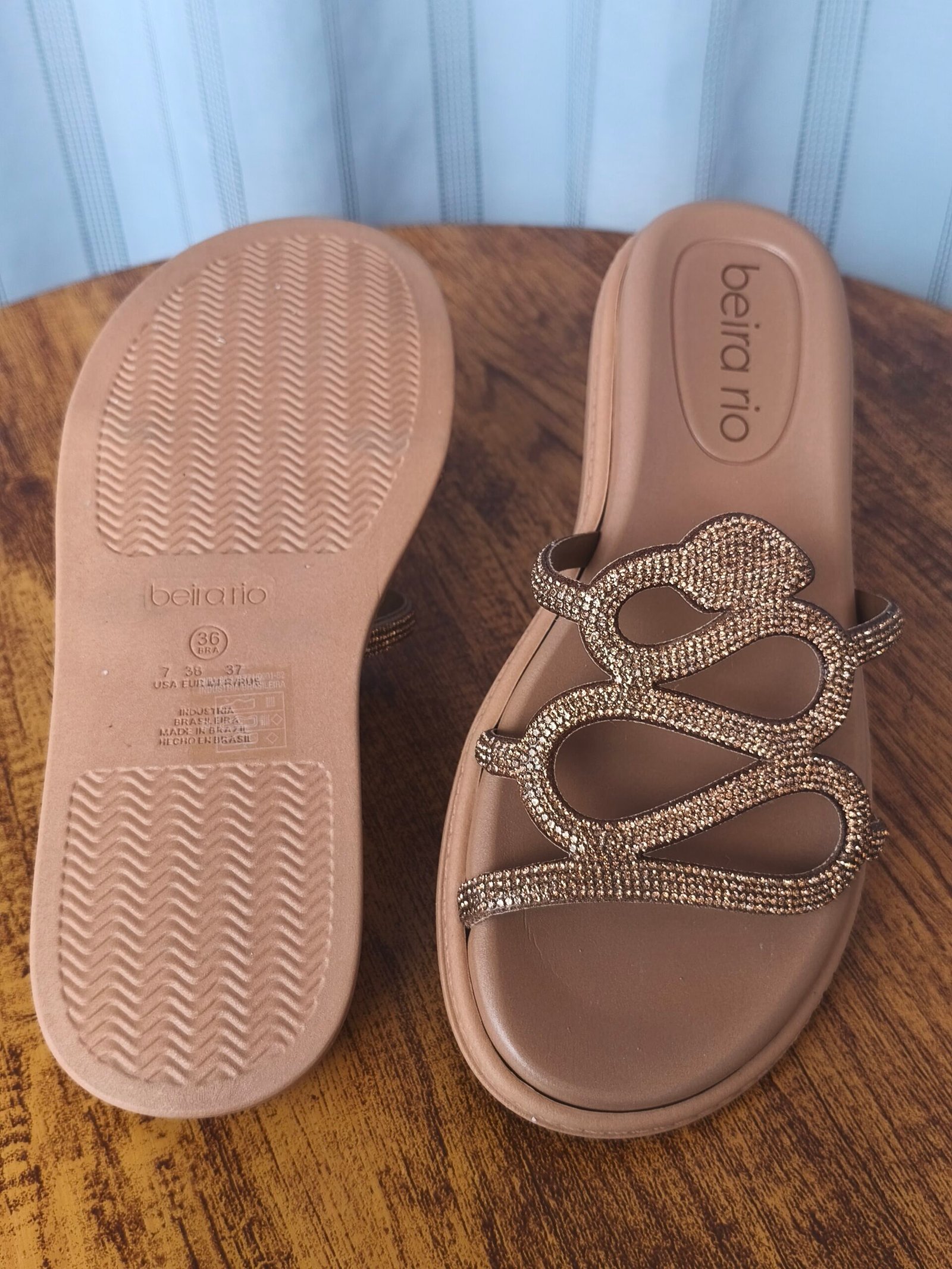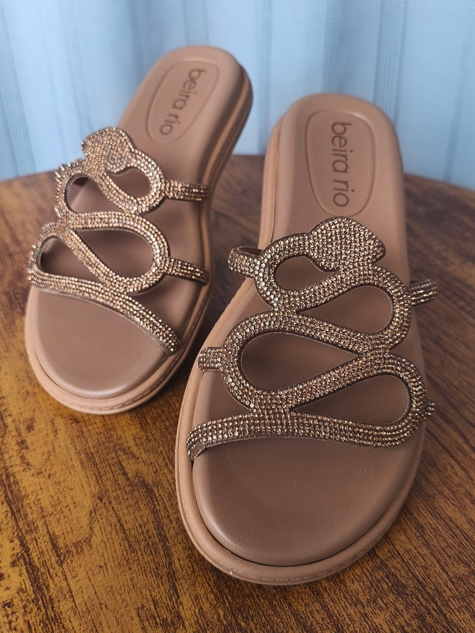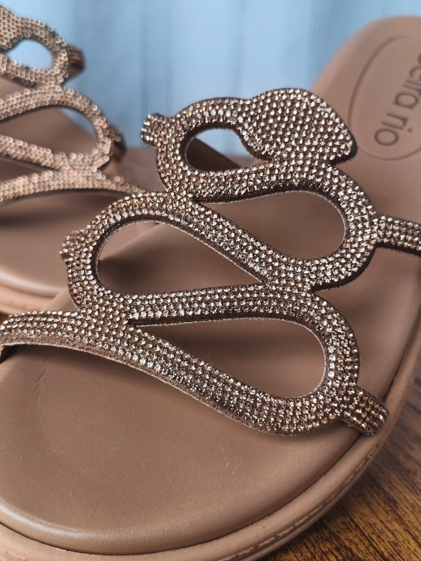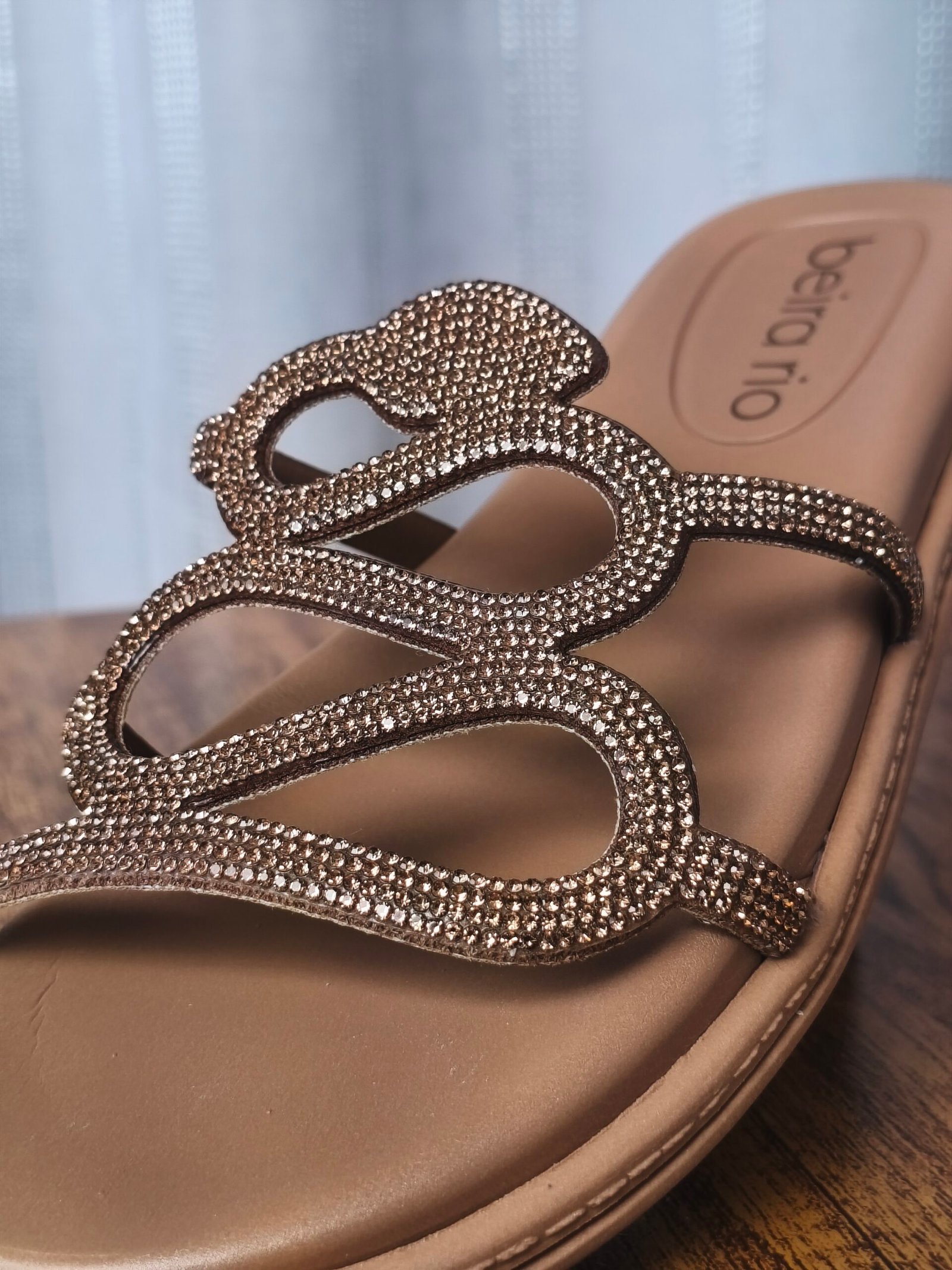 - Toque de Glamour: As tiras são totalmente revestidas por micro-brilhos (strass/glitter), injetando um glamour sutil e sofisticado. O brilho dá um acabamento mais elegante ao calçado, permitindo que ele transite do casual para ocasiões que pedem um toque a mais.
