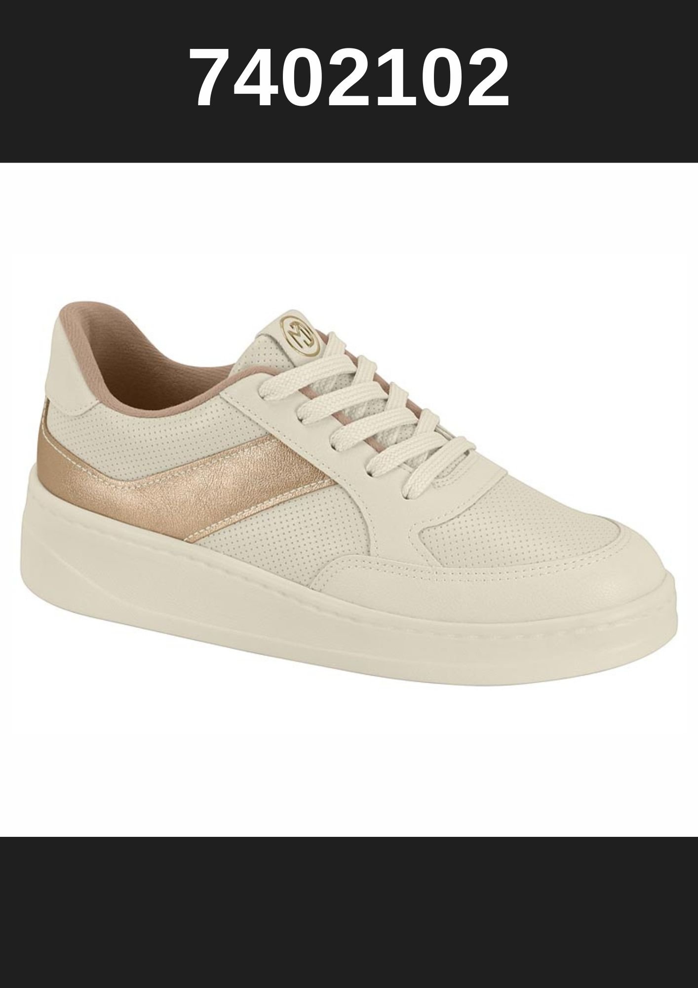 - Toque de Sofisticação: Na cor Off White (ou Creme), este tênis possui um detalhe de faixa metalizada em Rosé/Dourado na lateral, que adiciona um toque sutilmente elegante e moderno ao design clássico de bico arredondado.